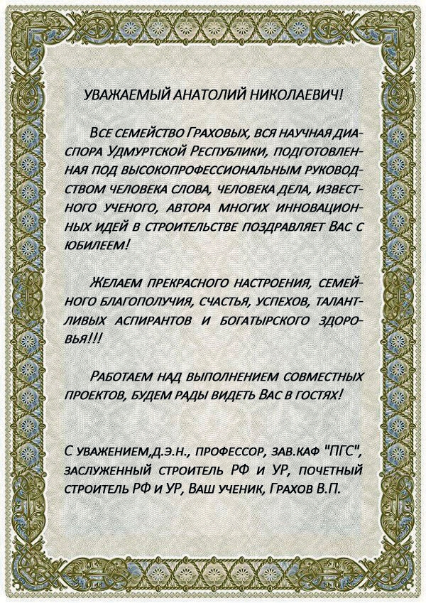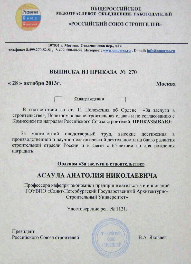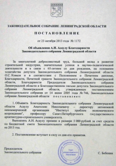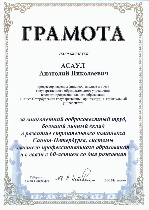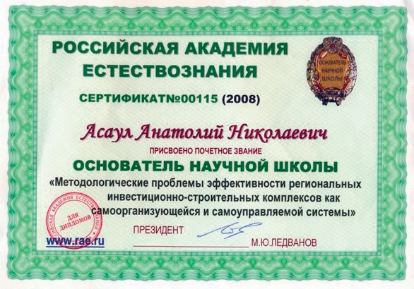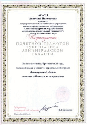 Директор АНО «Институт проблем экономического возрождения», профессор Санкт-Петербургского архитектурно-строительного университета, главным научному сотруднику Института проблем региональной экономики РАН, академику Международной академии менеджмента, Международной академии инвестиций и экономики строительства, РАЕН, Академии экономических наук Украины, заслуженному строителю РФ, заслуженному деятелю науки РФ, почётному строителю России, доктору экономических наук, профессору АСАУЛУ АНАТОЛИЮ НИКОЛАЕВИЧУ!