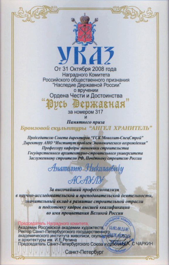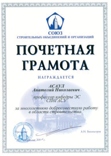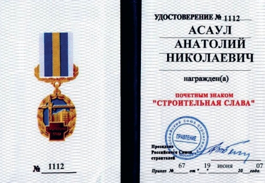В книге «Лучшие строители Санкт-Петербурга», внёсшие значительный вклад в развитие строительной отрасли России и Санкт-Петербурга, значится имя заслуженного строителя Российской Федерации, почётного строителя России, обладателя нагрудных знаков «Строителю Санкт-Петербурга» и «Строительная слава» Анатолия Николаевича Асаула, для которого профессия строителя стала призванием. Он трижды (2001, 2003, 2004) Ассоциацией менеджеров России был включён в рейтинг «Тысяча самых профессиональных менеджеров России». В 2002 году за вклад в области стратегического менеджмента награждён «Золотой медалью SPI» (Франция).
