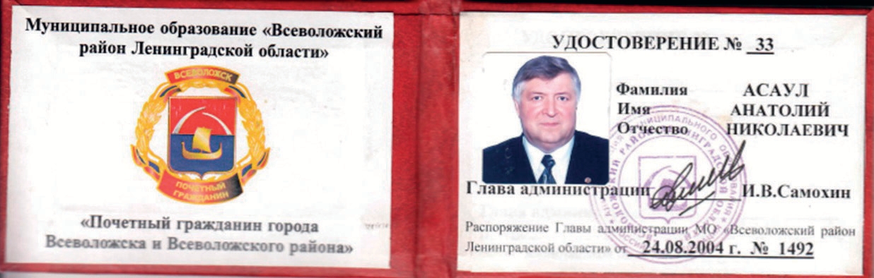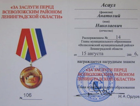 Безупречная репутация и высший авторитет А. Н. Асаула, приобретённый длительной плодотворной хозяйственной, благотворительной и просветительской работой, получил признание в становлении и развитии района. Совет депутатов Всеволожского района Ленинградской области присвоил А. Н. Асаулу звание «Почётный гражданин города Всеволожска и Всеволожского района Ленинградской области» (2004 год). Это особая форма признательности, уважения жителей Всеволожского района к Анатолию Николаевичу Асаулу, внёсшего большой вклад в социально-экономическое, общественное и культурное развитие района.