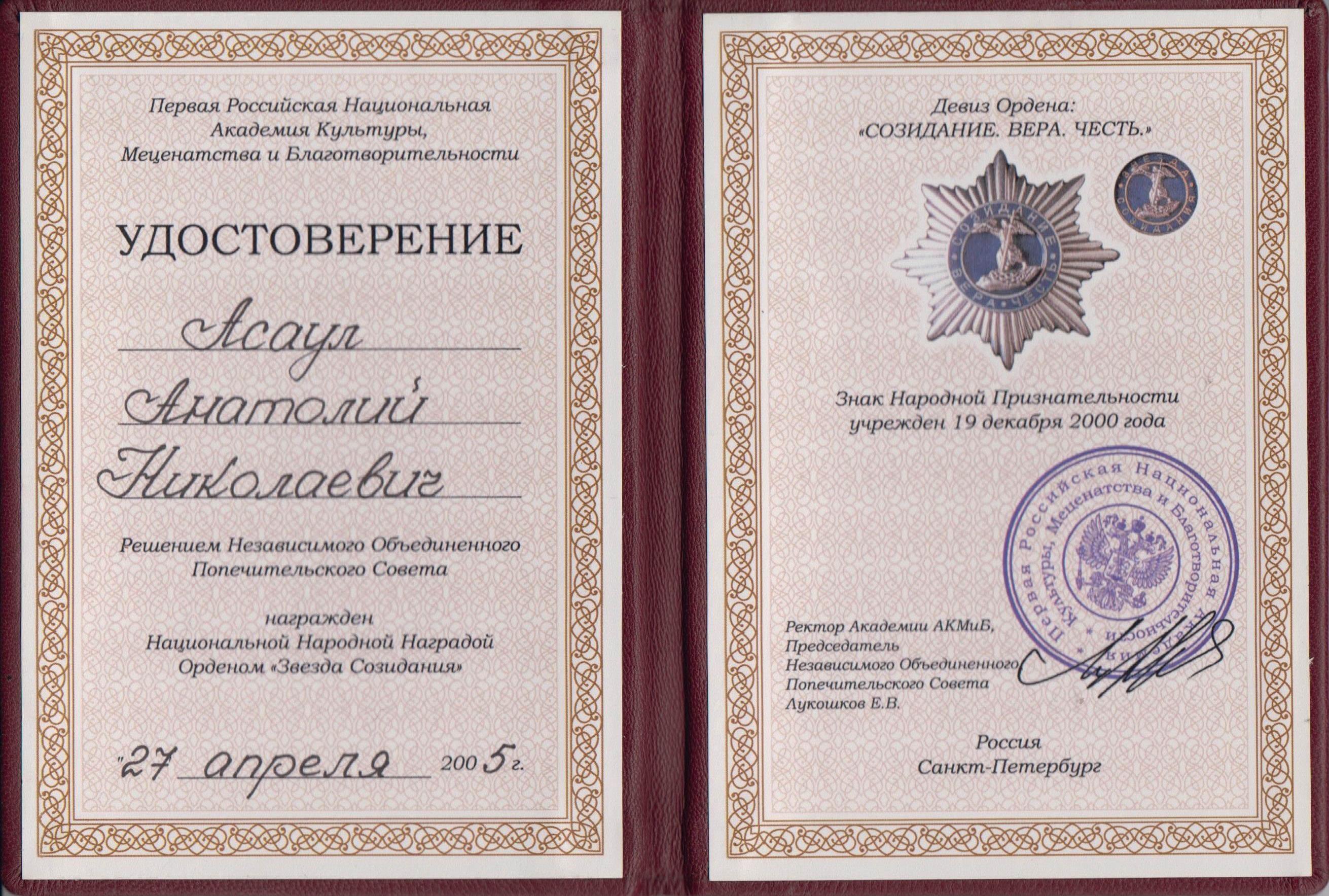 За созидательный труд во славу Отечества, активную поддержку и развитие лучших традиций российского предпринимательства, направленных на приумножение духовных богатств России, в 2005 году Первой Российской национальной академией культуры, меценатства и благотворительности, профессор Анатолий Николаевич Асаул награждён Общероссийской национальной народной наградой — орденом «Звезда созидания» (Учреждена в 2000 году как первая независимая награда для поддержания выдающихся деятелей культуры, науки и представителей деловых кругов, в своей деятельности опирающихся на принципы созидания, духовности и нравственности). Церемония награждения россиян, удостоенных ордена «Звезда созидания» проходит в Северной столице. По традиции — единственную в России национальную народную награду А. Н. Асаулу вручили в Петербургском дворце Белосельских-Белозерских на Невском проспекте.