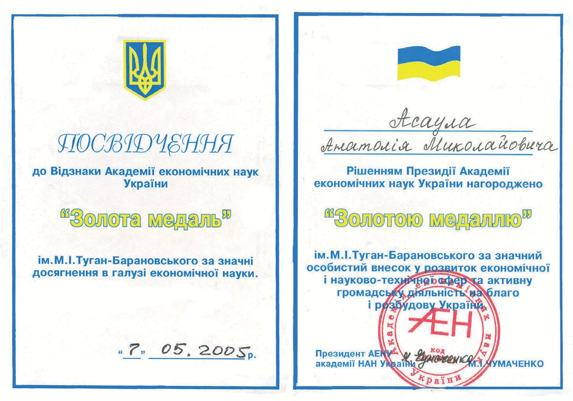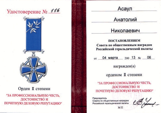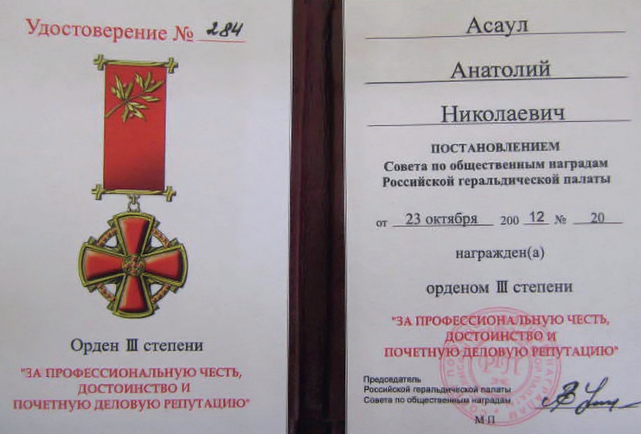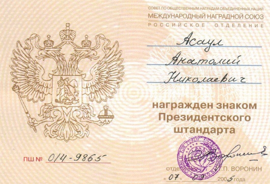 Анатолий Николаевич Асаул награждён знаком Президентского штандарта и именными часами «Президент» с автографом В. В. Путина (05.05.2005).