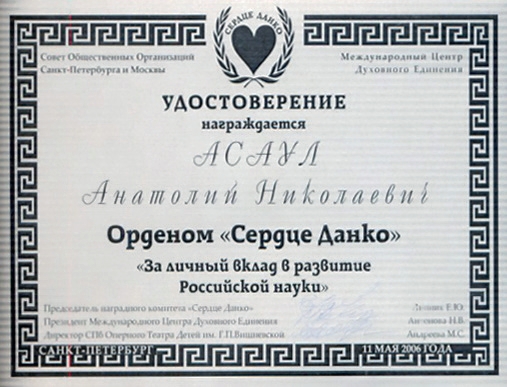 За личный вклад в развитие Российской науки и возрождение российских традиций наставничества в высшем образовании «Международным центром духовного единения» и «Советом общественных организаций Санкт-Петербурга и Москвы» А. Н. Асаул в 2006 году награждён орденом «Сердце Данко». (сердце Данко символизирует самопожертвование, героизм и любовь к людям)