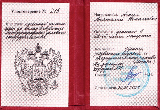 За вклад в развитие международного делового сотрудничества в 2006 году центром развития бизнеса и предпринимательства А. Н. Асаул награждён памятным знаком.