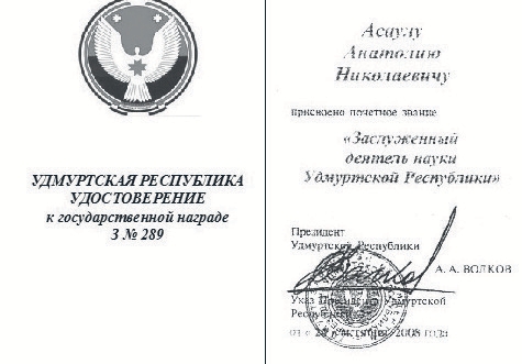 Президент Удмуртской республики в 2008 году присвоил профессору, д. э. н. А. Н. Асаулу почётное звание «Заслуженный деятель науки Удмуртской республики» за развитие научно-исследовательской деятельности в образовательных организациях высшего образования Удмуртии с привлечением студентов, аспирантов и молодых учёных, в том числе и за подготовку научных кадров для вузов, за успешное внедрение и использование научных разработок в экономике республики.