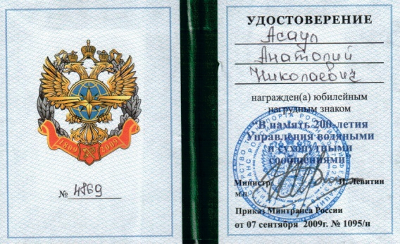 «В память 200-летия Управления водяными и сухопутными сообщениями» выпускник Ленинградского института железнодорожного транспорта А. Н. Асаул в 2009 году награждён юбилейным нагрудным знаком Министерства транспорта РФ.