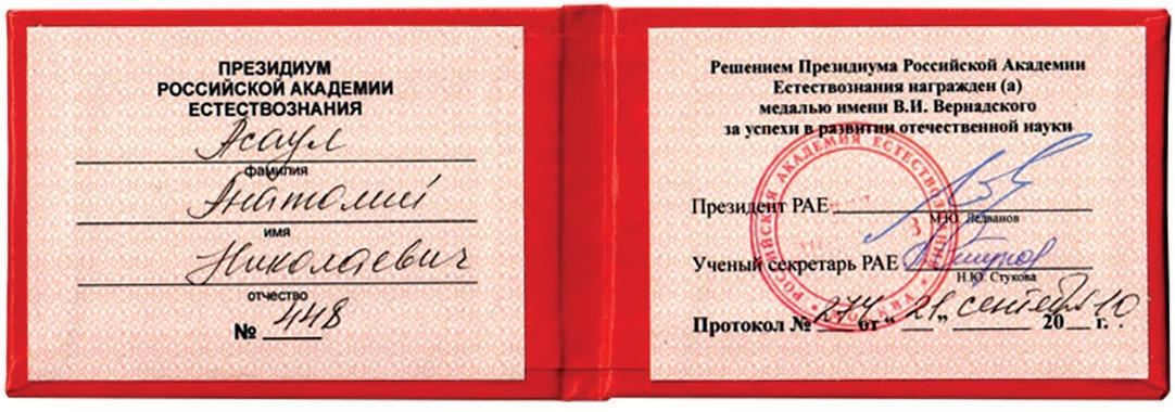 За вклад в развитие изобретательства Российской академией естествознания профессор А. Н. Асаул в 2009 году награждён медалью имени А. Нобеля.