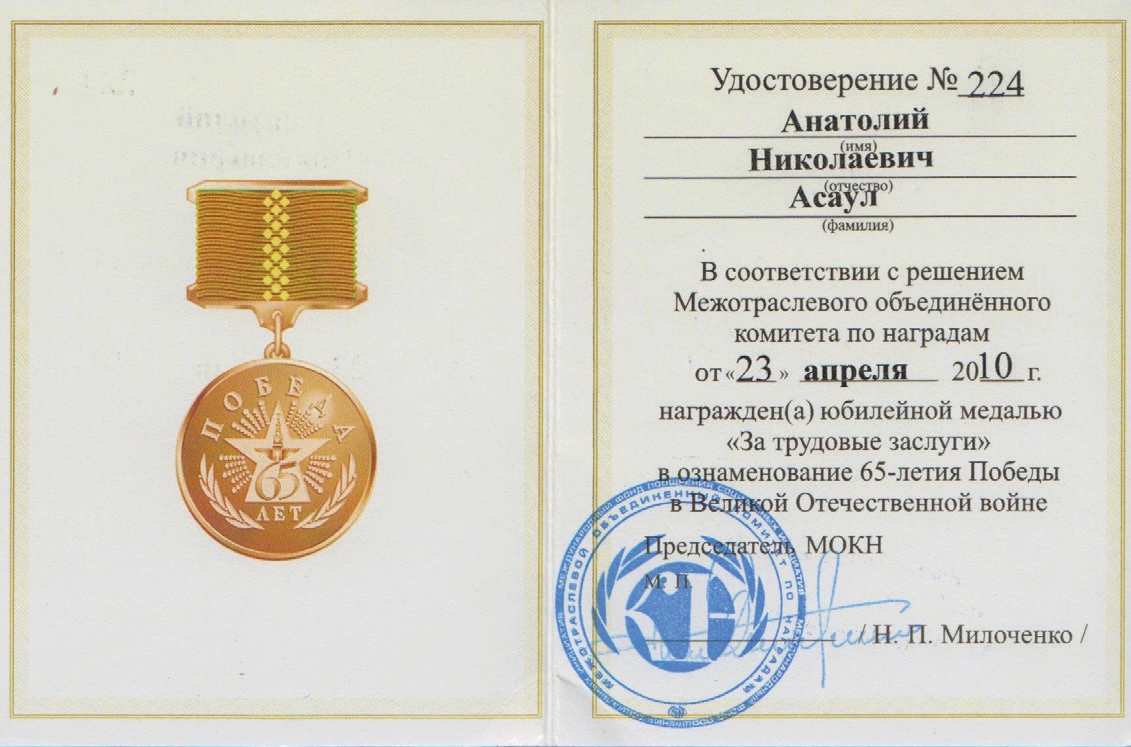 Тридцать пять лет трудовой деятельности А. Н. Асаула непосредственно связаны со строительством. Его карьера начиналась в 1966 году с разнорабочего. Он прошёл все карьерные ступени до генерального директора акционерного общества «ПСО Леноблгазпроект». Основные аспекты его трудовой деятельности изложены на страницах 22–23 настоящей книги. Здесь мы отметим только один эпизод, связанный с вручением Анатолию Николаевичу почётного знака «30 лет преобразования Ленинградской области» (2007 год). Награду вручил первый заместитель министра сельского хозяйства РФ Николай Васильевич Широков, отметивший: