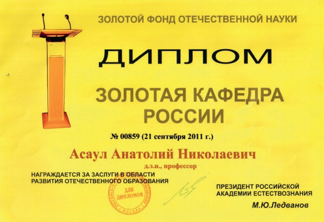 За научное руководство студенческой работой (П. Б. Люлин), отмеченной золотой медалью «За лучшую научную студенческую работу», профессор А. Н. Асаул награждён дипломом Минобразования и науки РФ (2005 год).