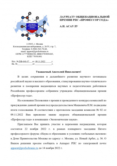Профессор А. Н. Асаул — член Сената ВЭО России!