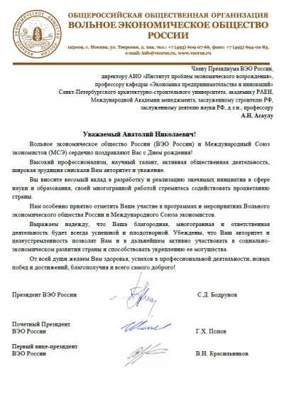 Профессор А. Н. Асаул — член Сената ВЭО России!