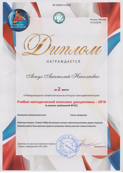 Профессор А.Н. Асаул занял 2 место в Международном профессиональном конкурсе преподавателей ВУЗов «Учебно-методический комплекс дисциплины – 2016» (в рамках требований ФГОС)