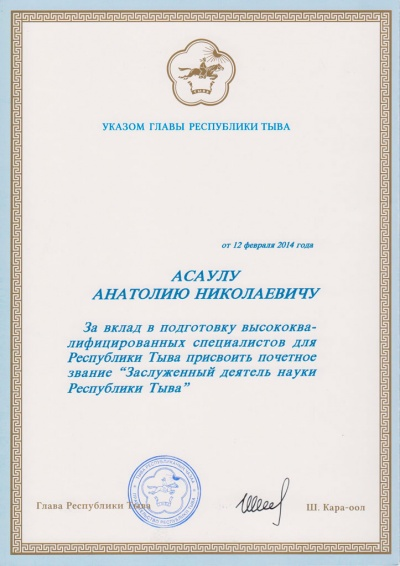 12 февраля 2014 года - присвоение почетного звания "Заслуженный деятель науки Республики Тыва"