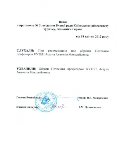 18 апреля 2012 года профессор Асаул Анатолий Николаевич избран Почетным профессором Киевского университета туризма, экономики и права