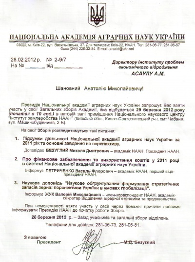 27 марта А.Н. Асаул принял участие в заседании отделения Академии аграрной экономики и продовольствия Национальной академии аграрной науки Украины