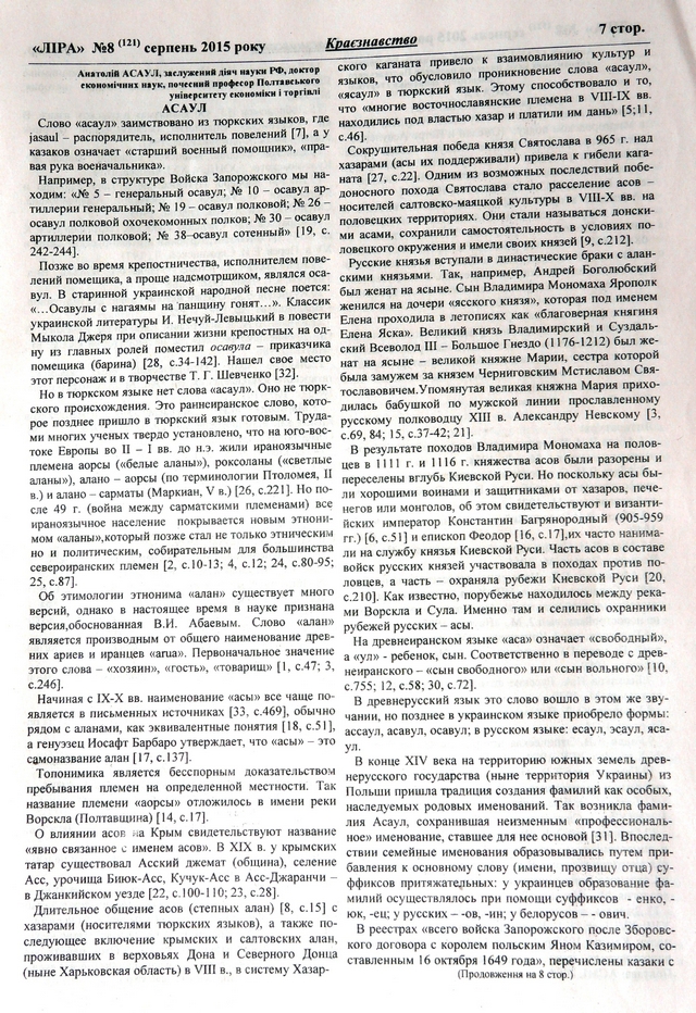 Но в тюркском языке нет слова «асаул». Оно не тюркского происхождения. Это раннеиранское слово, которое позднее пришло в тюркский язык готовым. Трудами многих ученых твердо установлено, что на юго-востоке Европы во II – Iвв. до н.э. жили ираноязычные племена аорсы («белые аланы»), роксоланы («светлые аланы»), алано – аорсы (по терминологии Птоломея, II в.) и алано – сарматы (Маркиан, V в.) [26, с.221]. Но после 49 г. (война между сарматскими племенами) все ираноязычное население покрывается новым этнонимом «аланы», который позже стал не только этническим, но и политическим, собирательным для большинства североиранских племен [2, с.10-13; 4, с.12; 24, с.80-95; 25, с.87]. Об этимологии этнонима «алан» существует много версий, однако в настоящее время в науке признана версия, обоснованная В.И. Абаевым. Слово «алан» является производным от общего наименование древних ариев и иранцев «arua». Первоначальное значение этого слова – «хозяин», «гость», «товарищ» [1, с.47; 3, с.246].