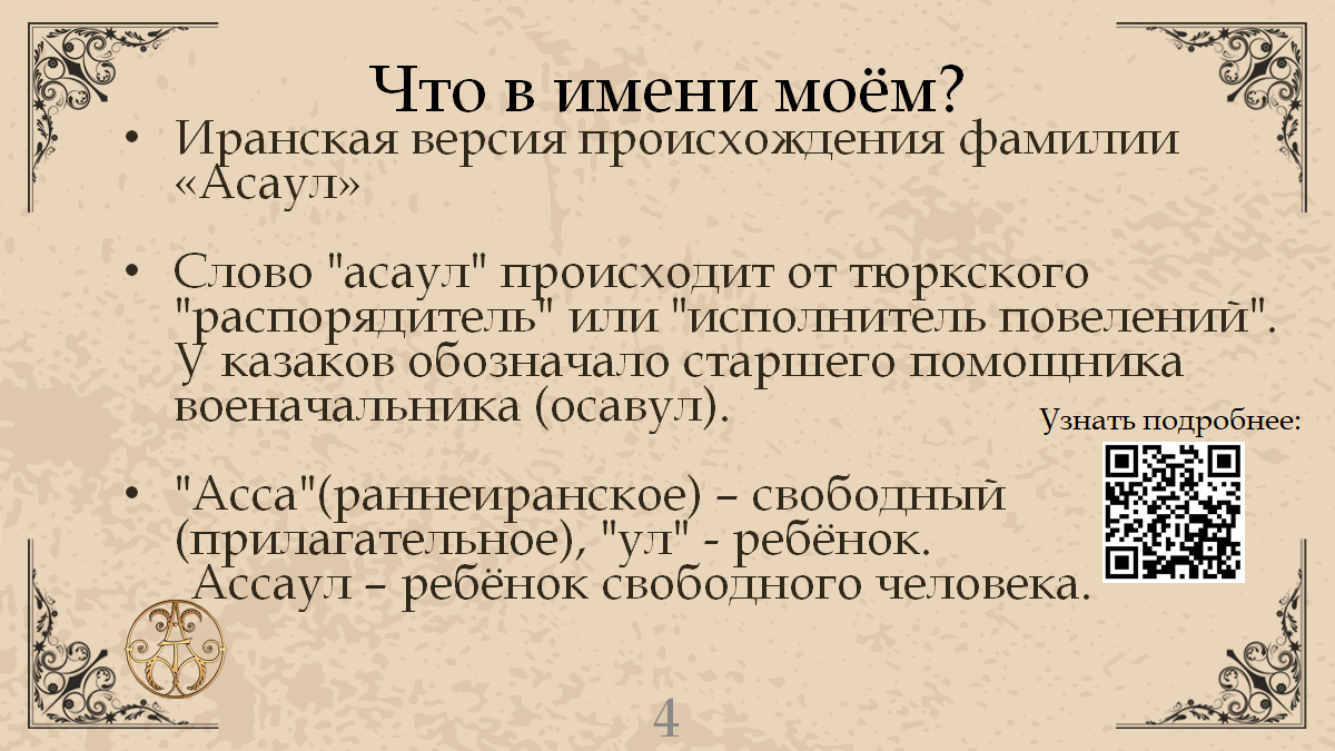 На древнеиранском языке «аса» означает «свободный», а «ул» - ребенок, сын. Соответственно в переводе с древнеиранского – «сын свободного» или «сын вольного» [10, с.755; 12, с.58; 30, с.72]. В древнерусский язык это слово вошло в этом же звучании, но позднее в украинском языке приобрело формы: ассаул, асавул, осавул; в русском языке: есаул, эсаул, ясаул.