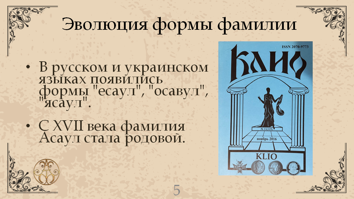 В конце XIVвека на территорию южных земель древнерусского государства (ныне территория Украины) из Польши пришла традиция создания фамилий как особых, наследуемых родовых именований. Так возникла фамилия Асаул, сохранившая неизменным «профессиональное» именование, ставшее для нее основой [31]. Впоследствии семейные именования образовывались путем прибавления к основному слову (имени, прозвищу отца) суффиксов притяжательных: у украинцев образование фамилий осуществлялось при помощи суффиксов - енко, - юк, -ец; у русских – -ов, -ин; у белорусов – - ович.
