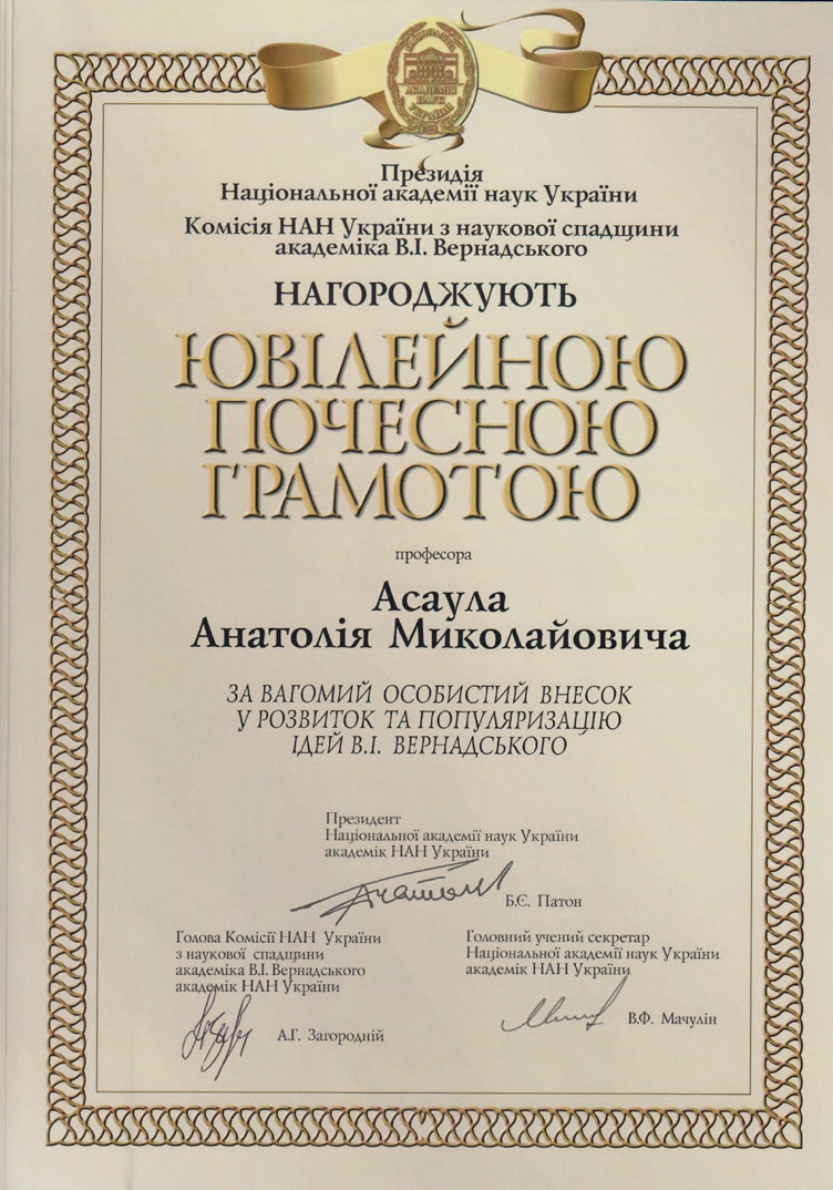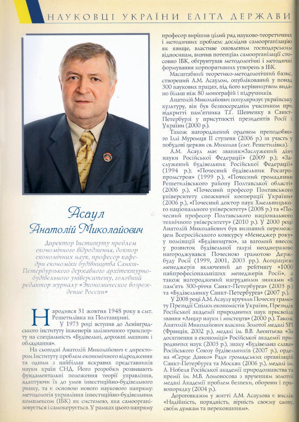 В 2010 году в Киеве вышла в свет книга «Науковці України — еліта держави», изданная Национальной академией наук Украины. В аннотации отмечается: «Учёные Украины — элита государства» — книга о титанах науки, её вечных энтузиастах, вдохновлённых экспериментаторах, неутомимых исследователях. Это уникальный труд, где собраны имена наталантливейших учёных, создающих историю общества и государства». Среди многочисленных титанов науки приведена биографическая справка профессора А. Н. Асаула, отмеченной его научные достижения и девиз: «Надёжность, порядочность, верность своему слову, своим мыслям и убеждениям». (стр. 52).