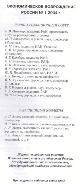 • «Экономическое возрождение России в XX веке»: Материалы VII всероссийской научно-практической конференции: Научные труды Вольного экономического общества России т. 69 — М., СПб: ВЭО, 2006 — 624 с. ISBN 5-91460-053;