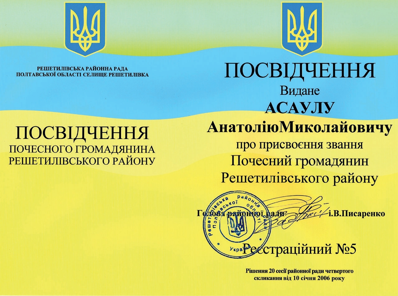«Решетиловская земля подарила нам много известных личностей. Обильным цветом разлетелись они по миру. Но в течение жизни не забывали землю, которая их взрастила и наполнила творческим талантом. Они поддерживали и поддерживают тесные связи с родным краем. И хотя их жизненные дороги пролегают вдали от родины, они духовно и практически делами являются настоящими сыновьями родного края — представителей этой плодной земли. Одним из них является А. Н. Асаул, уроженец Решетиловки, который вот уже 47 лет живёт в далёком Санкт-Петербурге. Но его душа и сердце всегда отзываются любовью к своему роду и народу».