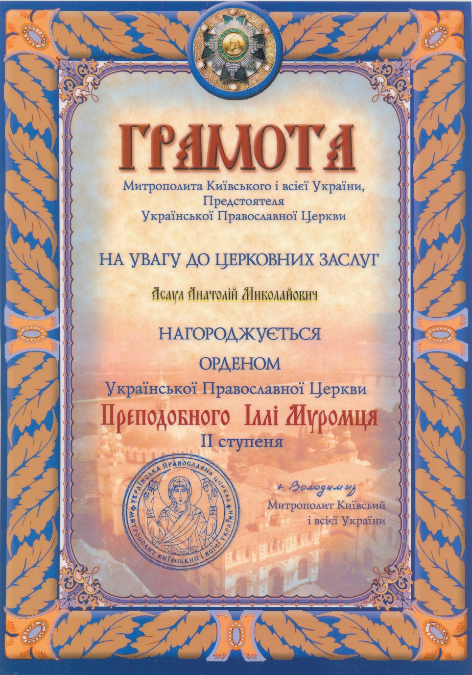 Кавалер Ордена Украинской Православной церкви Преподобного Ильи Муромца II степени (2006 год).