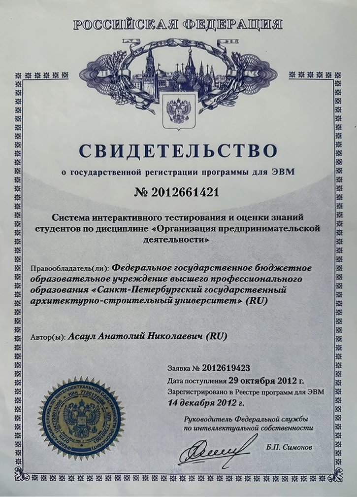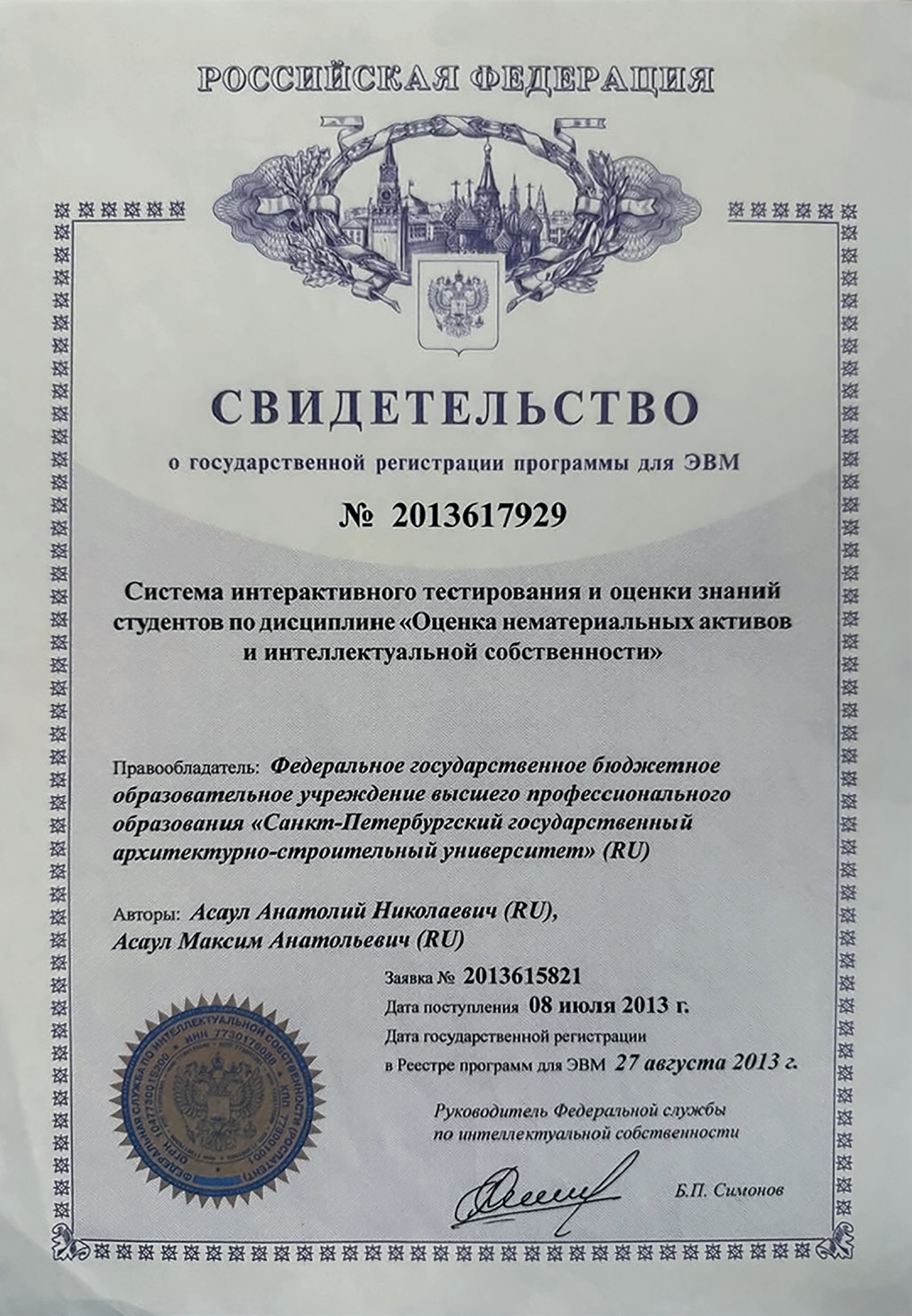 В 2013 году коллектив под руководством профессора А. Н. Асаула выиграл гранты на выполнение проекта РГНФ № 13-02-00065 «Исследование инвестиционно-строительного комплекса: теоретические, методологические и практические аспекты» и проекта РГНФ № 13-12-17002 «Разработка организационно-экономического механизма формирования целевой экономической зоны на территории Республики Тыва». А. Н. Асаулом выполнено фундаментальное исследование «Формирование механизмов управления развитием регионального инвестиционно-строительного комплекса как самоорганизующейся системы» по программе Министерства образования РФ «Научные исследования высшей школы по приоритетным направлениям науки и техники» (подпрограмма «Архитектура и строительство», раздел «Информационные технологии в строительстве, выявление эффективных экономических, организационных и управленческих механизмов, создание их математических моделей и численных методов реализации»).
