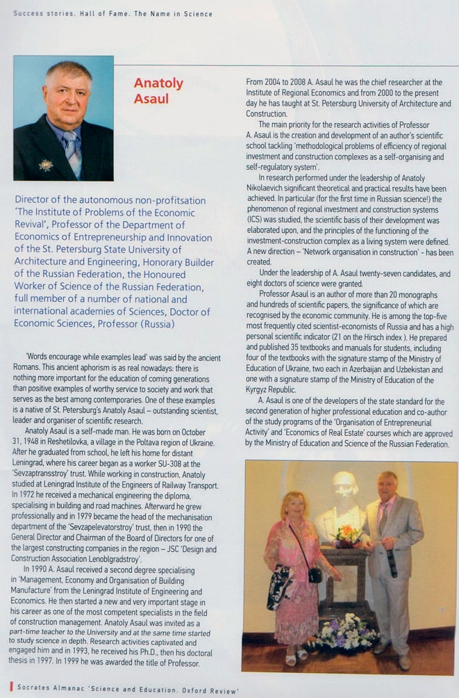 Биографическая справка: Анатолий Николаевич Асаул — талантливый человек талантлив во всём. Это изречение в полной мере относится к А. Н. Асаулу. Заслуженный строитель РФ, почётный строитель России, заслуженный деятель науки РФ, профессор кафедры экономики строительства Санкт-Петербургского архитектурно-строительного университета, главный научный сотрудник Института проблем региональной экономики РАН, главный редактор научного журнала «Экономическое возрождение России» — все это Анатолий Асаул.
