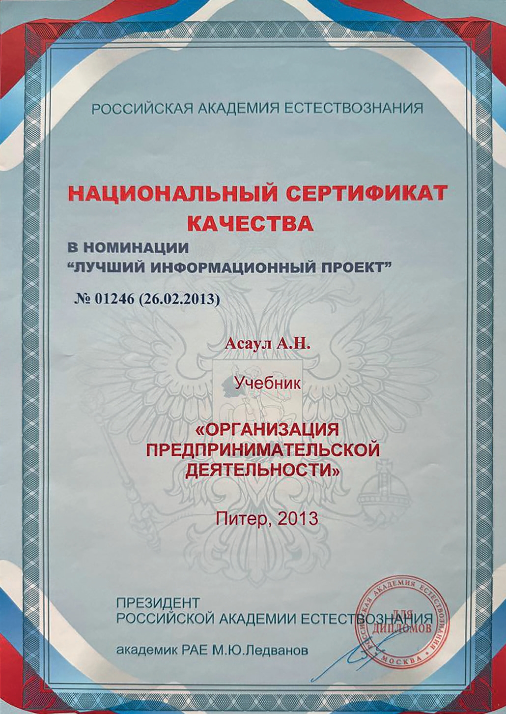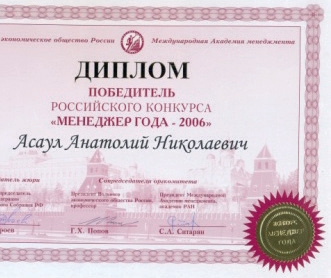 Лауреат конкурса Фонда развития отечественного образования (РФ) на лучшую научную книгу среди преподавателей высших учебных заведений в номинации «Менеджмент и маркетинг» за книгу «Менеджмент корпораций и корпоративное управление» / А. Н. Асаул (и др.). — СПб.: Гуманистика, 2006. — 328 с. (2007 год).