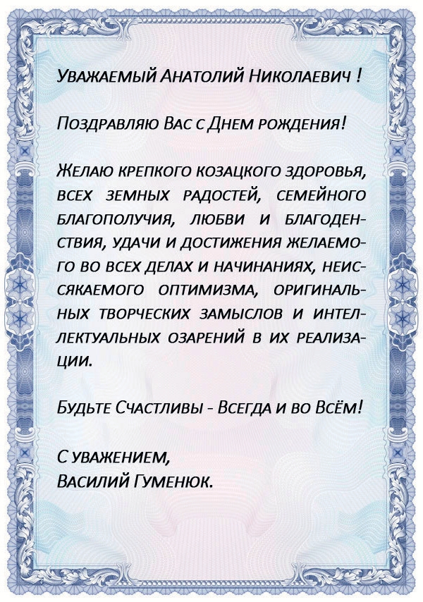 «После вручения Анатолий Николаевич сказал: “Для меня очень важно признание моих заслуг на родной земле. Всё, что дала малая родина, особенно ценно на расстоянии. Считал и считаю своим долгом помогать району, а особенно — по линии общей потребности развития района, чтобы люди могли и сказать: “Труд сделал из меня человека, а работа — гражданина”. И буду помнить заповедь: “Там родился — там и пригодился...”».