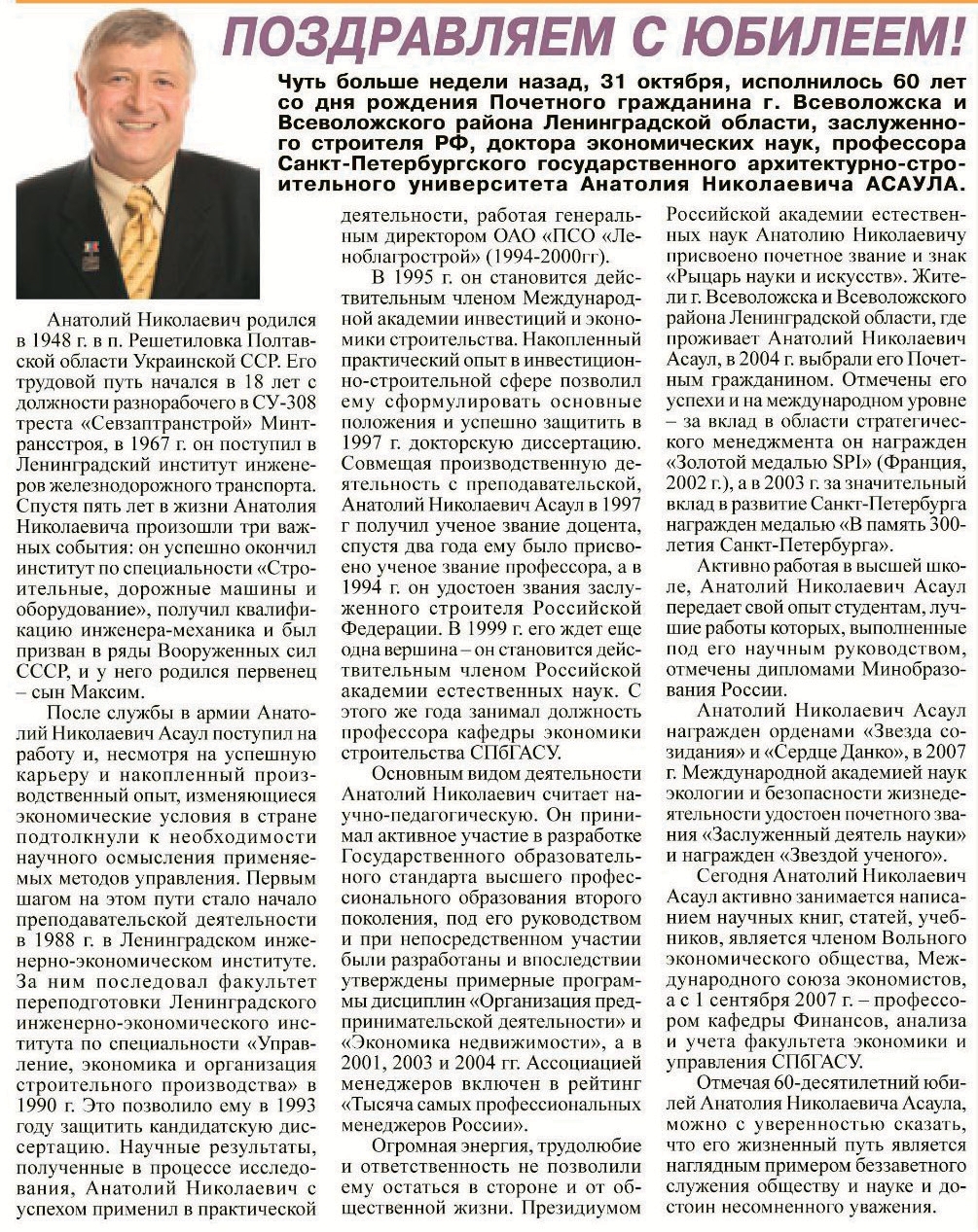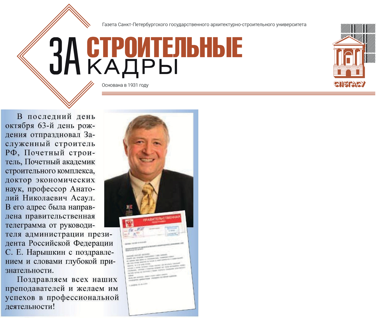 Директор АНО «Институт проблем экономического возрождения», профессор Санкт-Петербургского архитектурно-строительного университета, главным научному сотруднику Института проблем региональной экономики РАН, академику Международной академии менеджмента, Международной академии инвестиций и экономики строительства, РАЕН, Академии экономических наук Украины, заслуженному строителю РФ, заслуженному деятелю науки РФ, почётному строителю России, доктору экономических наук, профессору АСАУЛУ АНАТОЛИЮ НИКОЛАЕВИЧУ!