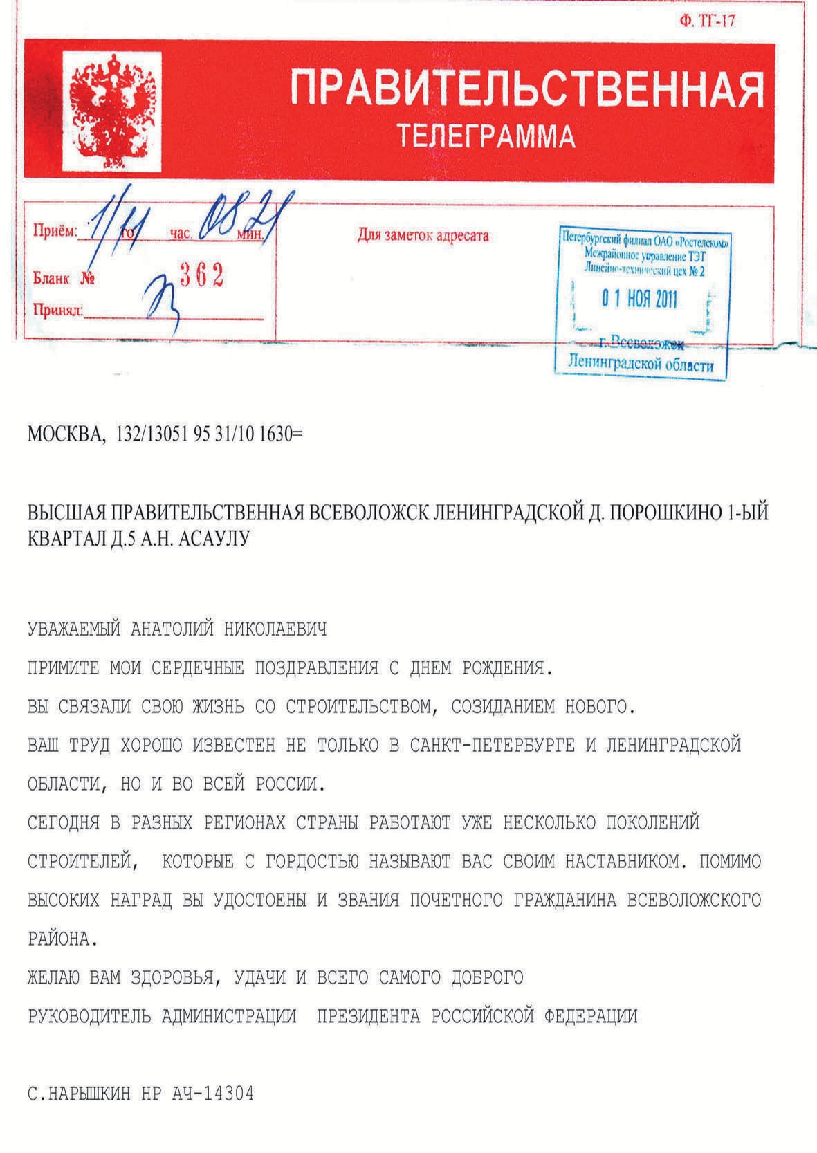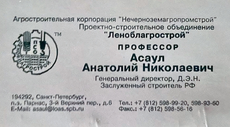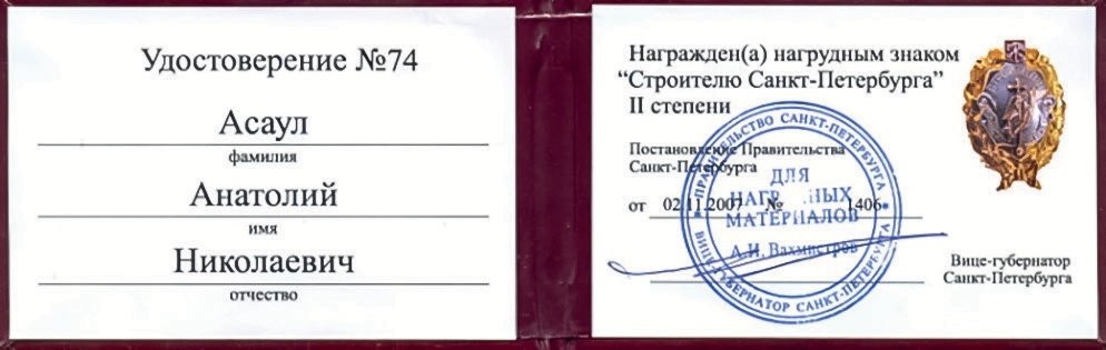 Тридцать пять лет трудовой деятельности А. Н. Асаула непосредственно связаны со строительством. Его карьера начиналась в 1966 году с разнорабочего. Он прошёл все карьерные ступени до генерального директора акционерного общества «ПСО Леноблгазпроект». Основные аспекты его трудовой деятельности изложены на страницах 22–23 настоящей книги. Здесь мы отметим только один эпизод, связанный с вручением Анатолию Николаевичу почётного знака «30 лет преобразования Ленинградской области» (2007 год). Награду вручил первый заместитель министра сельского хозяйства РФ Николай Васильевич Широков, отметивший: