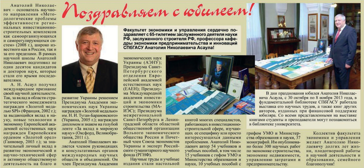 персональная выставка научных трудов заслуженного деятеля науки РФ, д. э. н., профессора А. Н. Асаула в научно-технической библиотеке Санкт-Петербургского государственного архитектурно-строительного университета (30 октября – 8 ноября 2013 года).