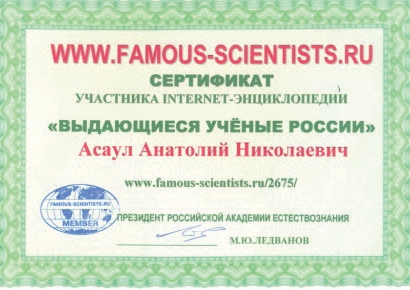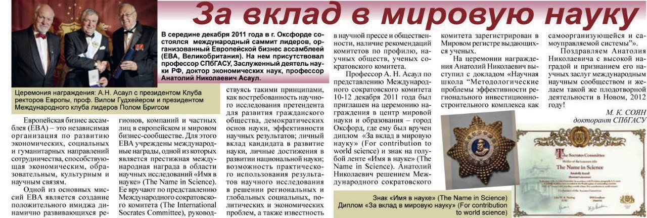 Профессор А. Н. Асаул сотрудничает со множеством научных общественных организаций. Сократовский альманах одна из них. В издании 2013 года раздел World scientists. Success stories («Учёные мира. Истории успеха») открывается статьёй члена редакционного совета альманаха — Анатолия Николаевича Асаула.