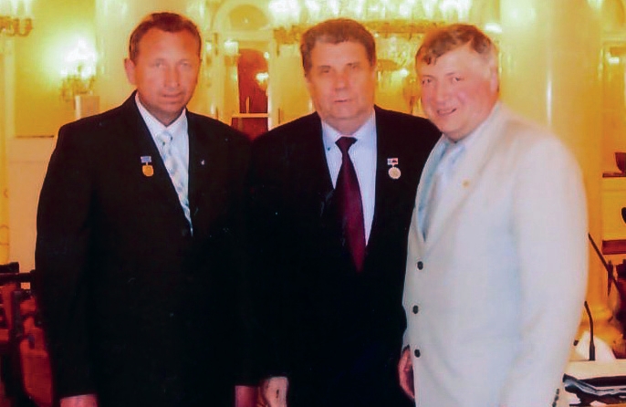 По завершению VI съезда РСС можно сфотографироваться с президентом Союза строителей В. Н. Забелиным. Слева — почётный строитель России Евгений Скуматов, защитивший кандидатскую диссертацию под руководством А. Н. Асаула