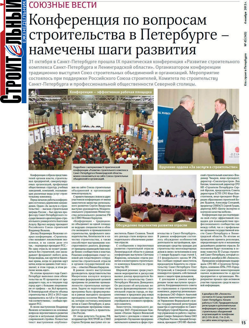 В Санкт-Петербурге 31 октября прошла IX практическая конференция «Развитие строительного комплекса Санкт-Петербурга и Ленинградской области». Организатором конференции традиционно выступил Союз строительных объединений и организаций. Мероприятие состоялось при поддержке Российского Союза строителей, Комитета по строительству Санкт-Петербурга и профессиональной общественности Северной столицы.
