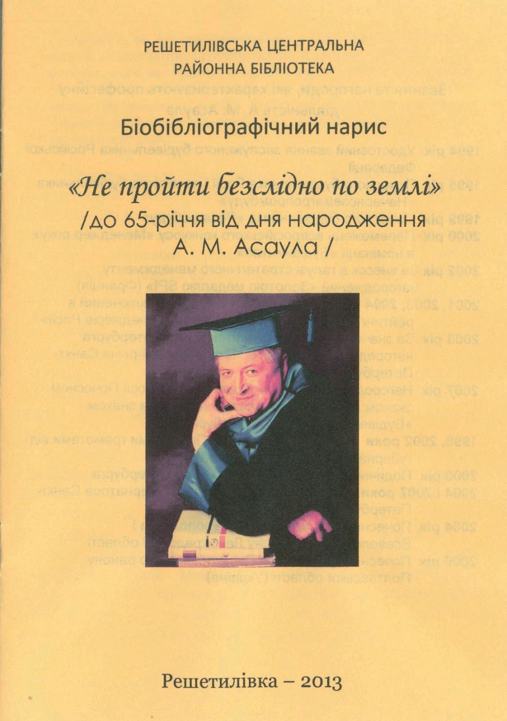 К 65-летию земляка А. Н. Асаула работники Решетиловской центральной районной библиотеки подготовили библиографический очерк и издали его в виде буклета. Приведём некоторые выдержки из этой книжечки.