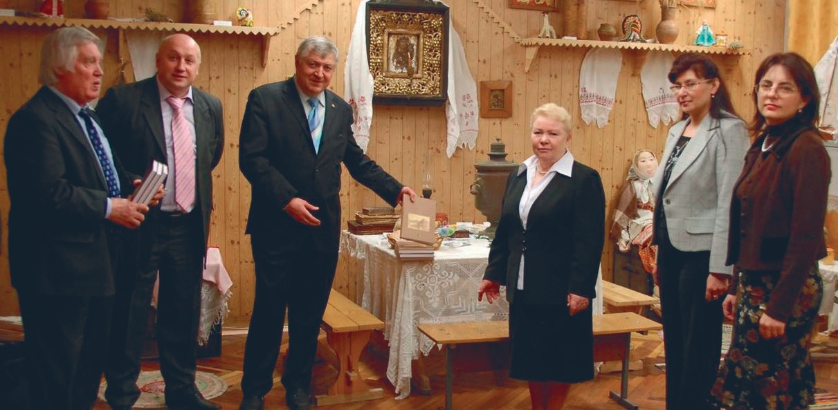 В зале школьного музея «Горница» А.М. Дмитренко, лауреат национальной премии им. Т.Г. Шевченко (Украина); И.В. Петренко; А.Н. Асаул; Л.И. Ершова, директор школы №595 Т.Ю. Ягнеша, зав. школьным музеем, раскрывающим особенности славянской культуры, и учитель украинского языка и литературы О.Ю. Ващенко. Санкт-Петербург. 2008 год