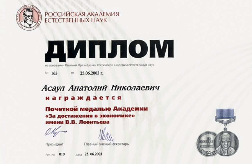 А. Н. Асаул — лауреат конкурса Фонда развития отечественного образования на лучшую научную книгу 2008 года среди преподавателей высших учебных заведений в номинации «Экономика» за книгу «Модернизация экономики на основе технологических инноваций» / А. Н. Асаул (и др.). — СПб. АНО ИПЭЭС, 2008. — 606 с. (2009 год).
