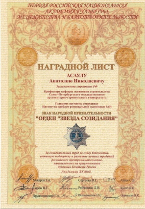 За созидательный труд во славу Отечества, активную поддержку и развитие лучших традиций российского предпринимательства, направленных на приумножение духовных богатств России, в 2005 году Первой Российской национальной академией культуры, меценатства и благотворительности, профессор Анатолий Николаевич Асаул награждён Общероссийской национальной народной наградой — орденом «Звезда созидания» (Учреждена в 2000 году как первая независимая награда для поддержания выдающихся деятелей культуры, науки и представителей деловых кругов, в своей деятельности опирающихся на принципы созидания, духовности и нравственности). Церемония награждения россиян, удостоенных ордена «Звезда созидания» проходит в Северной столице. По традиции — единственную в России национальную народную награду А. Н. Асаулу вручили в Петербургском дворце Белосельских-Белозерских на Невском проспекте.