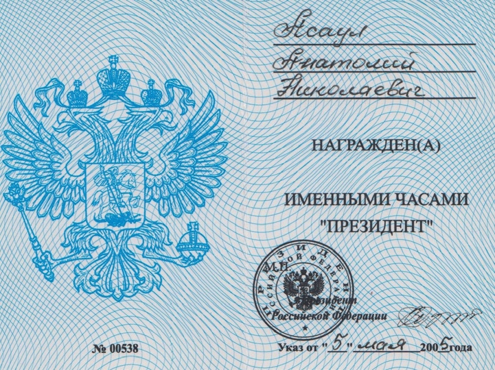 Анатолий Николаевич Асаул награждён знаком Президентского штандарта и именными часами «Президент» с автографом В. В. Путина (05.05.2005).