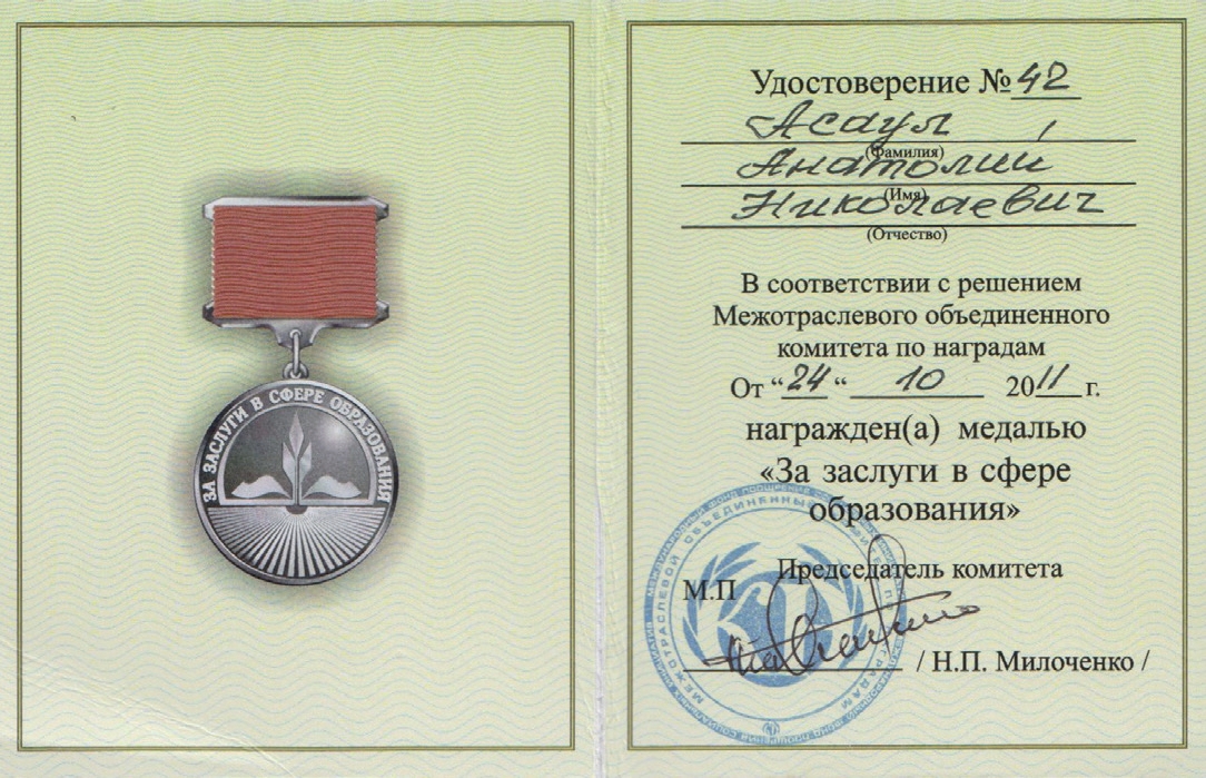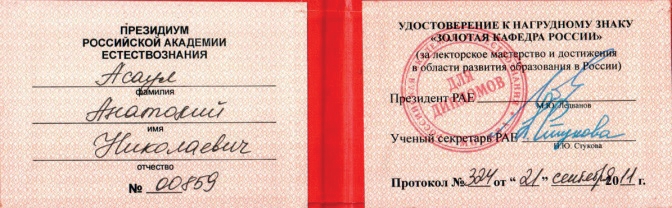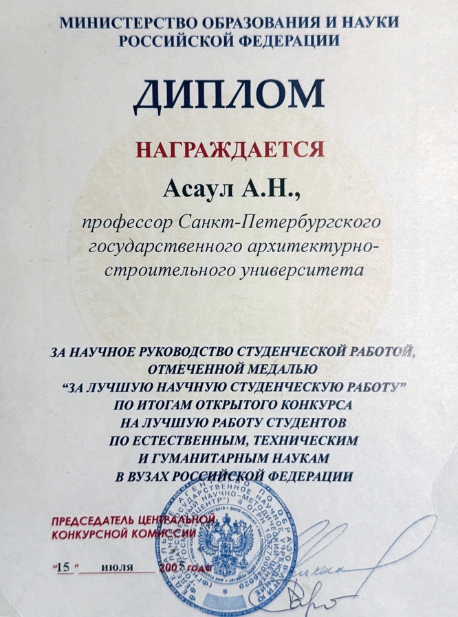За научное руководство студенческой работой (П. Б. Люлин), отмеченной золотой медалью «За лучшую научную студенческую работу», профессор А. Н. Асаул награждён дипломом Минобразования и науки РФ (2005 год).