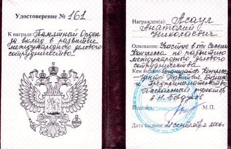 За вклад в развитие международного делового сотрудничества в 2006 году центром развития бизнеса и предпринимательства А. Н. Асаул награждён памятным знаком.