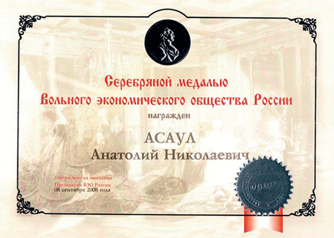 За многолетнее и плодотворное сотрудничество с Вольным экономическим обществом России, большой вклад в его деятельность, активное участие в реализации проектов и программ областей социально-экономического развития России, за участие в создании выдающихся социально-экономических медиапроектов на межгосударственном и региональном уровнях, за объективное и профессиональное освещение событий в области экономики и бизнеса в 2008 году профессор А. Н. Асаул награждён серебряной медалью ВЭО России. Медаль воссоздана по образцу медалей императорского Вольного экономического общества.