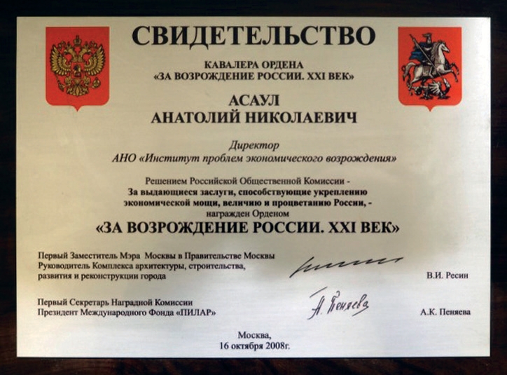 За выдающиеся заслуги, способствующие укреплению экономической мощи, величию и процветанию России, директор АНО «Институт проблем экономического возрождения», профессор А. Н. Асаул в 2008 году награждён орденом «За возрождение России в XXI веке» (Звезда Пилар).
