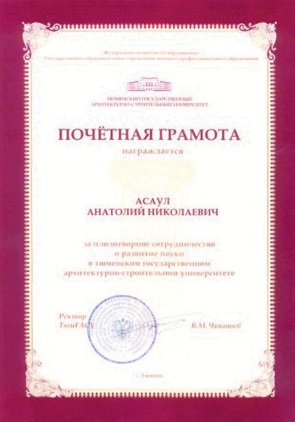 За плодотворное сотрудничество и развитие науки в Тюменском государственном архитектурно-строительном университете профессор А. Н. Асаул в 2008 году награждён почётной грамотой ректором ТюмГАСУ В. М. Чукишевым.