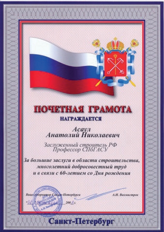 За большие заслуги в области строительства и многолетний добросовестный труд профессор А. Н. Асаул в 2008 году награждён почётной грамотой вице-губернатора Санкт-Петербурга А. И. Вахмистрова.