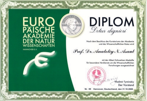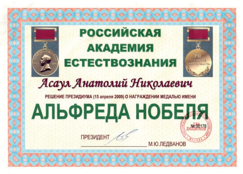 За вклад в развитие изобретательства Российской академией естествознания профессор А. Н. Асаул в 2009 году награждён медалью имени А. Нобеля.