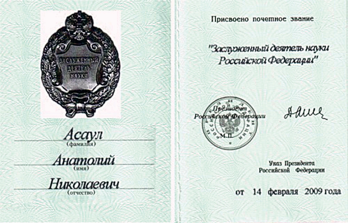 Заслуженный деятель науки Российской Федерации. Указ Президента РФ о присвоении профессору А. Н. Асаулу этой государственной награды подписан 14.02.2009 г, исходя из заключения Российской академии наук, свидетельствующего о признании научной общественностью как отечественной, так и зарубежной личных заслуг. Среди них: