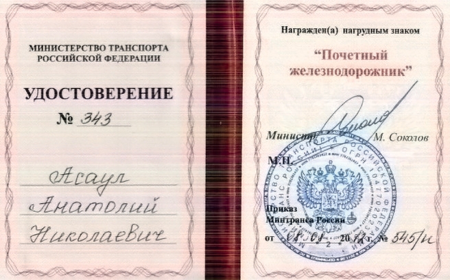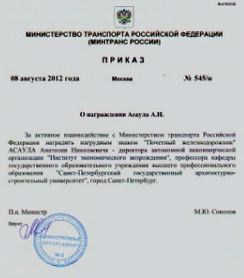 «В память 200-летия Управления водяными и сухопутными сообщениями» выпускник Ленинградского института железнодорожного транспорта А. Н. Асаул в 2009 году награждён юбилейным нагрудным знаком Министерства транспорта РФ.