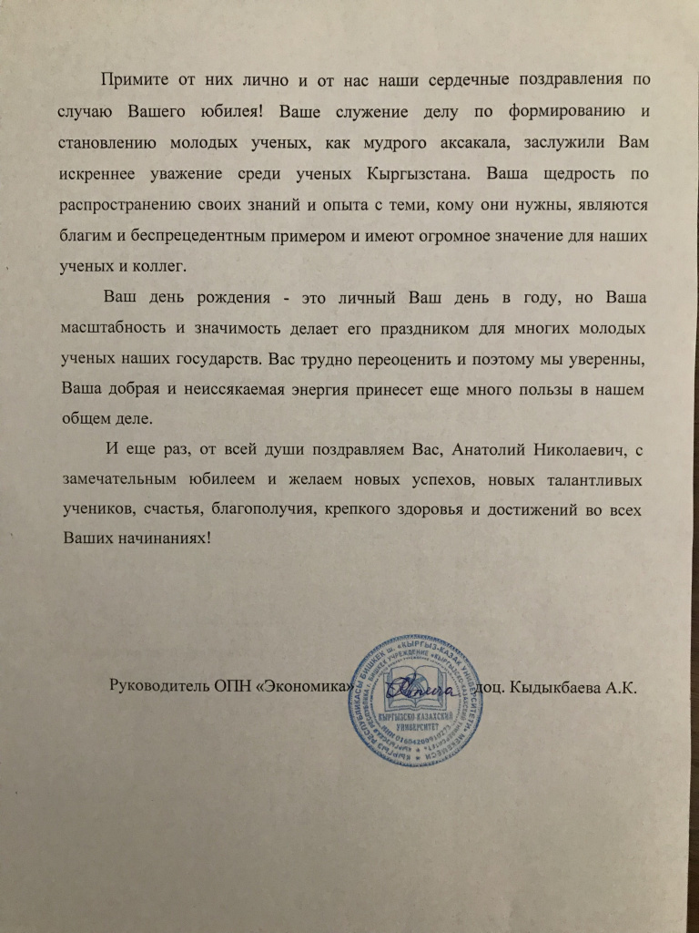 31 октября А.Н.Асаула поздравили Министерство образования и науки Кыргызской Республики, Кыргызско-Казахский университет.